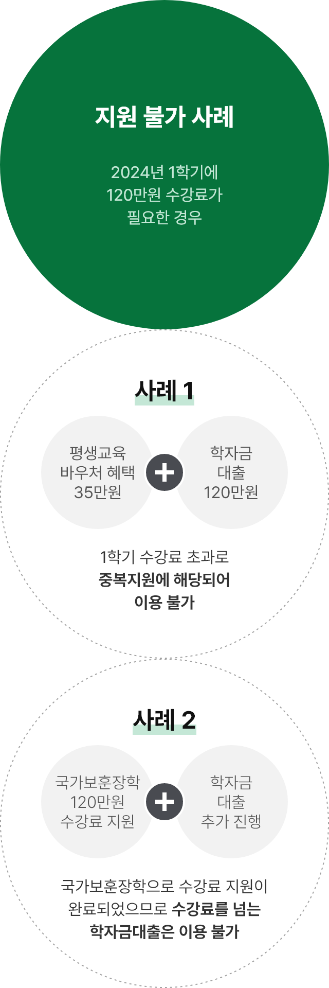 - 평생교육이용권/국가보훈장학/학자금대출은 중복지원에 포함되므로 제도 이용 시 주의바랍니다.